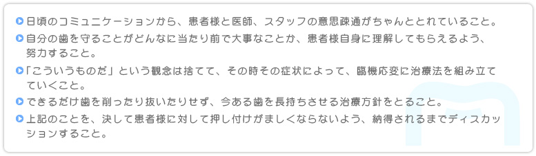 痛みを感じてからイヤイヤ行くのではなく、自発的に「治そう」と思って通院してもらえる歯医者でないと、意味がありません。歯の一番の主治医は、患者様自身なのです。